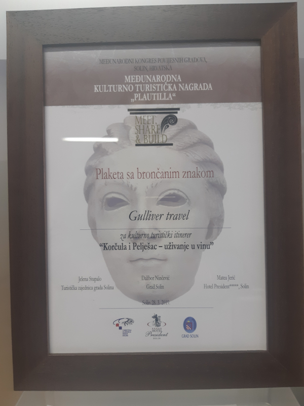 The special International cultural-tourism awards "Plautilla" for the quality and innovation in the management of historic cities, in the domain of interpretation and protection of cultural heritage, as well as the promotion and distribution of cultural tourism products, are also given at the congress. The prizes are awarded in several categories, and Gulliver travel is a proud owner of Plaques with the bronze sign for the itinerary "Korčula and Pelješac – wine delight" in the category "Best Cultural Tourist Itinerary". We are especially proud of this itinerary, which in a different way shows the best of the cultural heritage of Korčula and Pelješac, combining it with enogastronomic tradition in an irresistible whole.